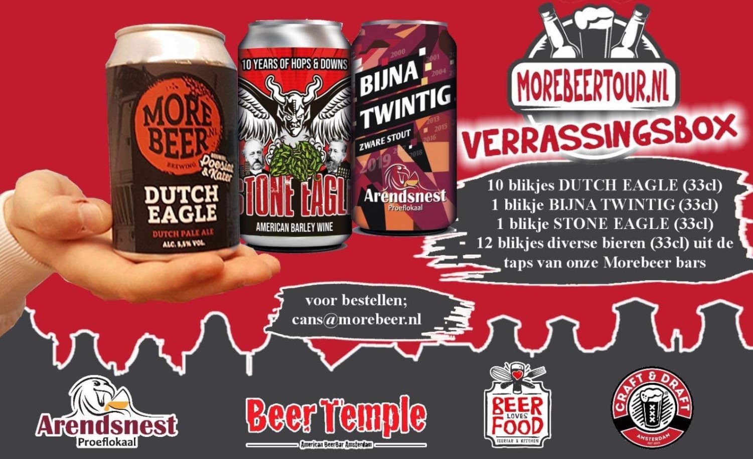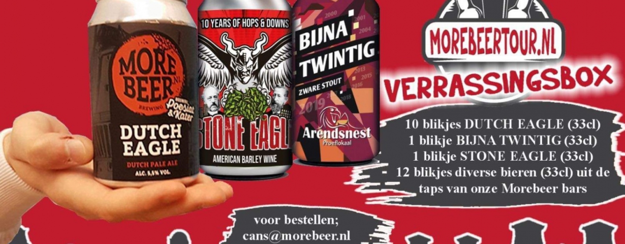 Nu de horeca gesloten is, vraagt Van der Arend steun door een mooie verrassingsbox aan te bieden. Deze bijzondere Morebeer Tour verrassingsbox met 24 blikjes kost 50,00 euro. Met 7,50 toeslag voor eventuele bezorging. In de box zitten de twee zilveren medaillewinnaars van Dutch Beer Challenge 2020!