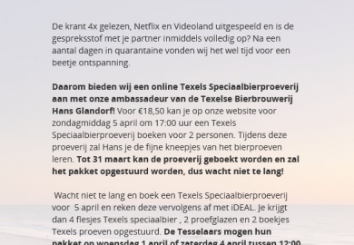 “Hans vertelt je de ins- en outs van onze Texels speciaalbieren via een live streaming op ons Youtubekanaal. Op donderdag 2 april krijg je een mail hoe je bij dit youtube kanaal kan komen. Natuurlijk is de uitzending na afloop van de live streaming ook terug te vinden op ons Youtube kanaal. Zo kan iedereen even met zijn gedachten naar ons mooie eiland Texel gaan, tijdens het proeven van onze heerlijke Texels speciaalbieren.