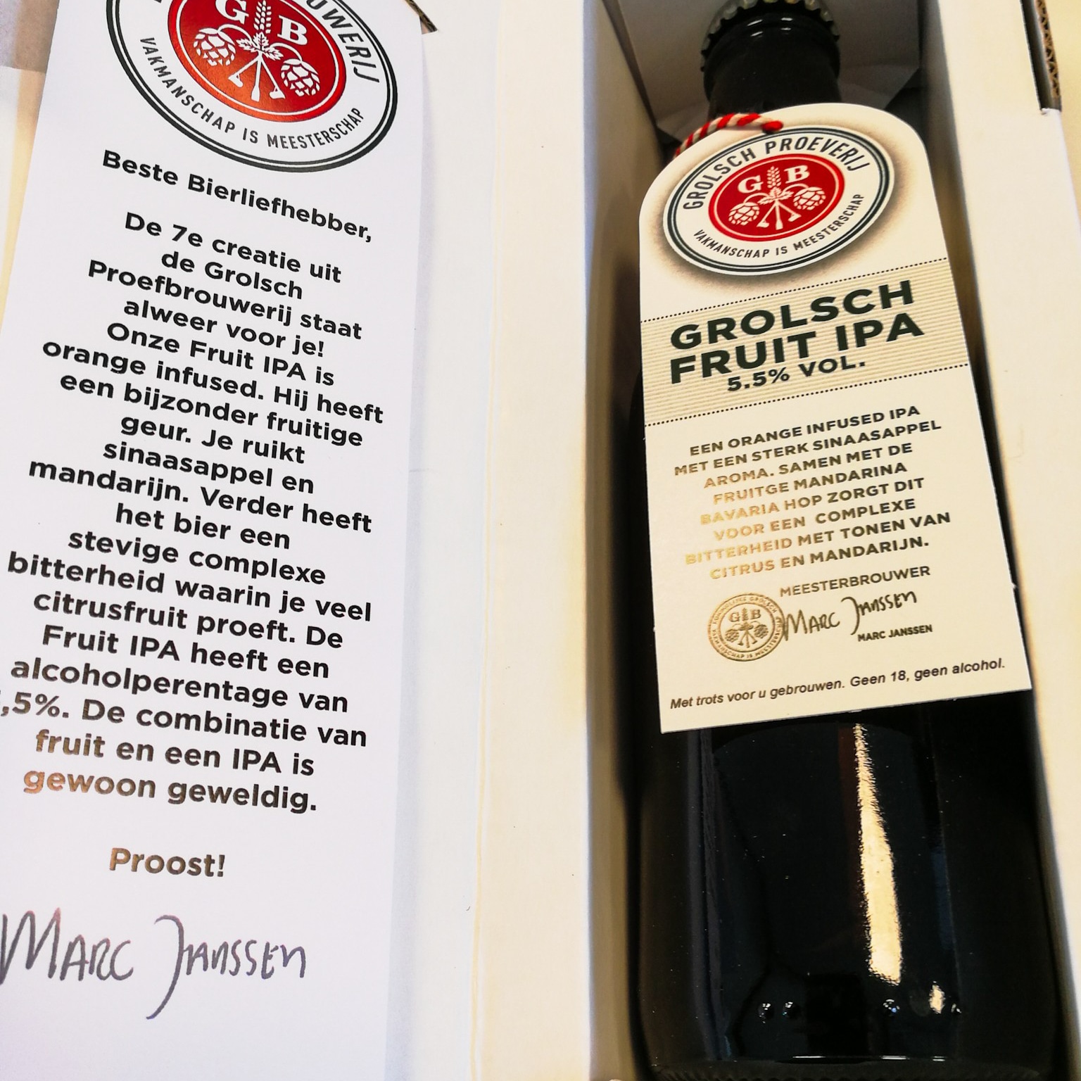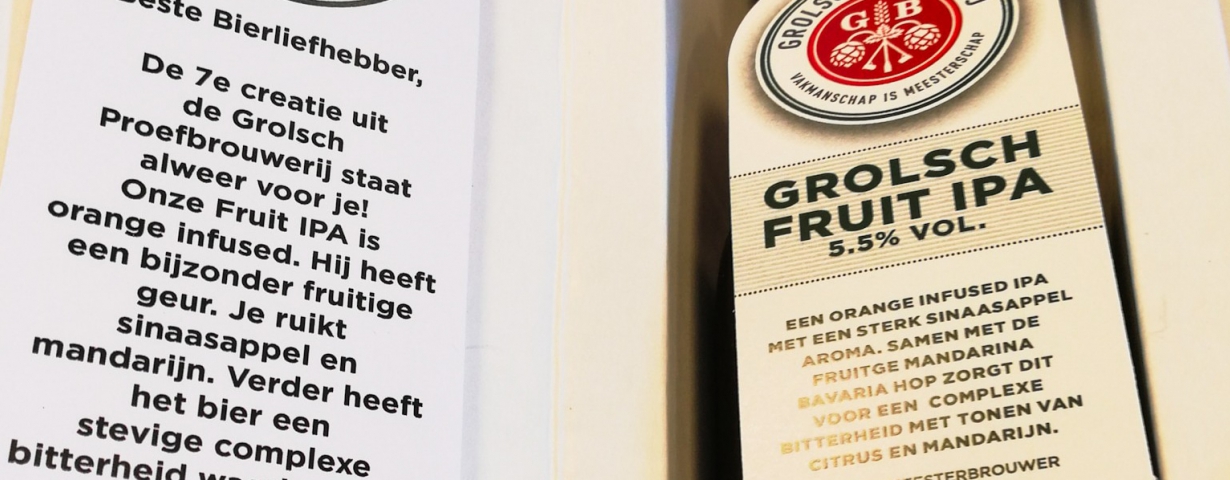 Grolsch is de laatste tijd actief met de eigen proefbrouwerij. Nieuwe bieren worden getest in een select aantal horecazaken en daarna worden ze, als de reacties goed zijn, in het assortiment opgenomen. Meesterbrouwer Marc Janssen was onlangs zelf op het Nederlands Bierproeffestival aanwezig om zijn speciaalbieren te tappen. Nieuw op het festival waren een orange infused IPA (fris en droog) en een Berliner Weisse, een bierstijl die een wat kleinere kring liefhebbers heeft. De Orange Infused IPA is er nu ook in beperkte oplage op fles. In de geselecteerde horecazaken van de Grolsch Proeverij is deze - mede door de fruitige Mandarina Bavaria hop - frisse Fruit IPA met een stevige, complexe bitterheid voorlopig te proeven. Het is al de zevende creatie uit de Grolsch Proeverij