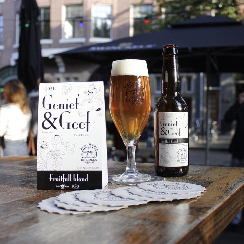De Geniet & Geef is een blond Brouwerij de Molen stijl, vol, moutig, licht kruidig en gedryhopt met Sorachi Ace. Deze, van Japanse origine, hopsoort zorgt voor mooie aroma’s zoals citrus en zoete vruchten waar lychee de boventoon in voert. De romige afdronk met een hint van karamel maakt dit unieke bier helemaal af. De Geniet & Geef is een Fruitfull Blond (6,5%) waar je rustig van kan genieten en tegelijkertijd iets teruggeeft.