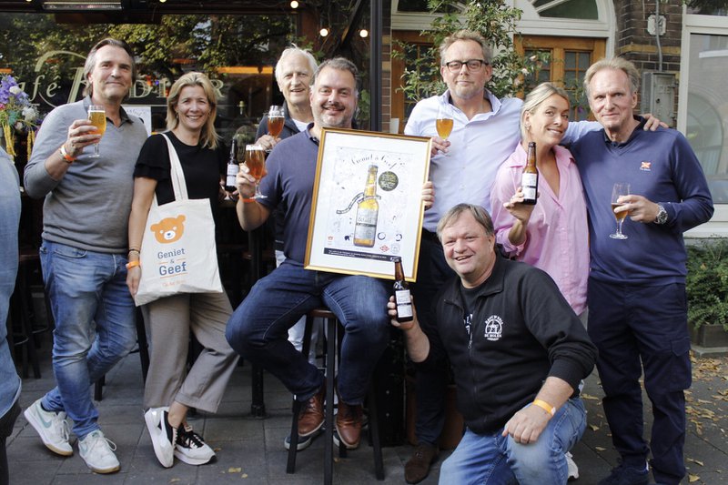Het team van Geniet & Geef en KiKa met Wilbert Gieske en (zittend) brouwer Jan Willem den Hartog van De Molen.