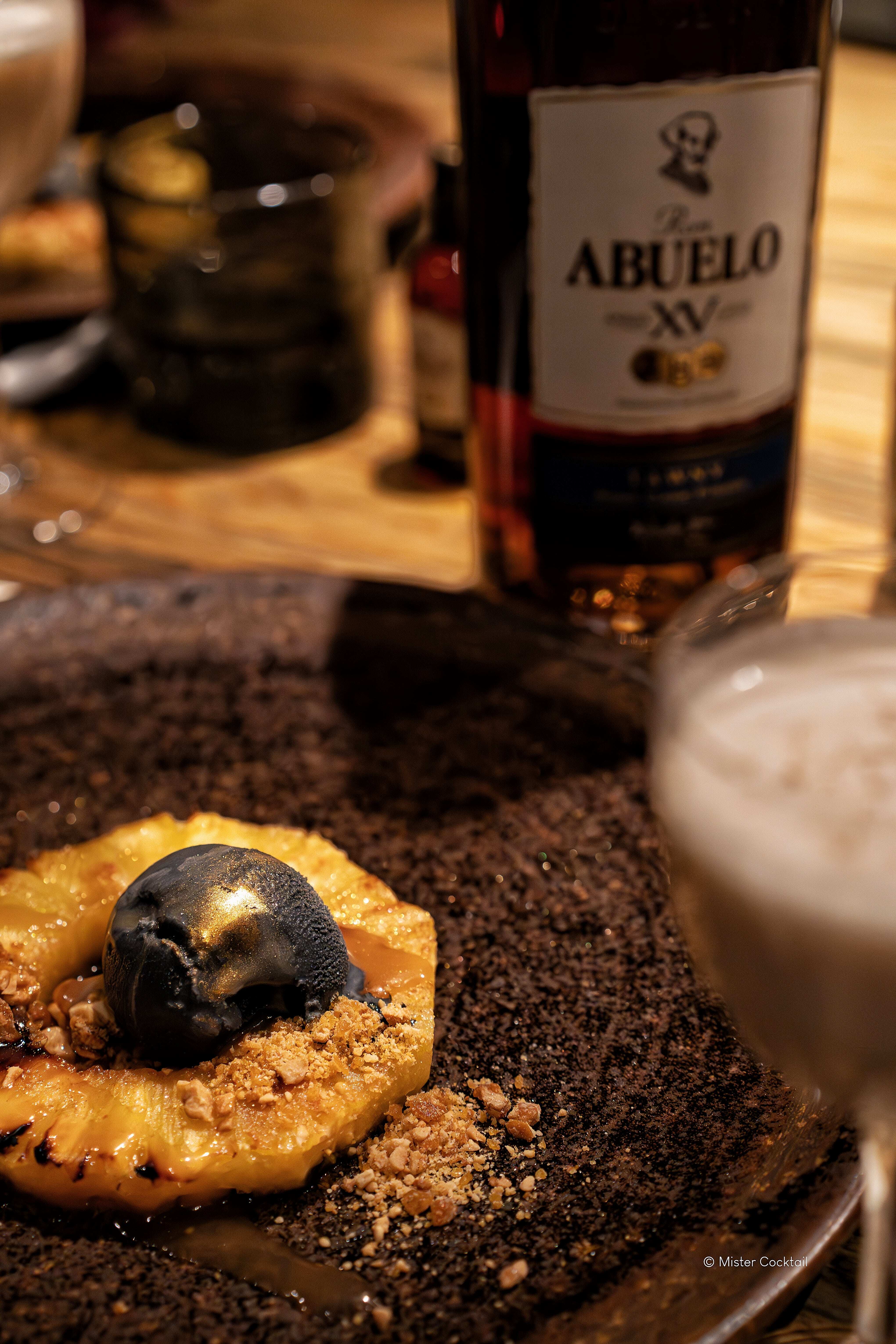 Dan is het tijd voor het dessert, geroosterde ananas met kokosnootijs en in rum gekarameliseerde cashewnoten. Merkin serveert de Smokey Chica Banana cocktail met Abuelo 7, een romige cocktail die mooi aansluit bij het dessert. De echte afsluiter moet dan nog komen; een glas van het ‘paradepaardje’, de 30 jaar oude Abuelo Centuria. Srokowski: “Dit is de smaak van onze legacy.”