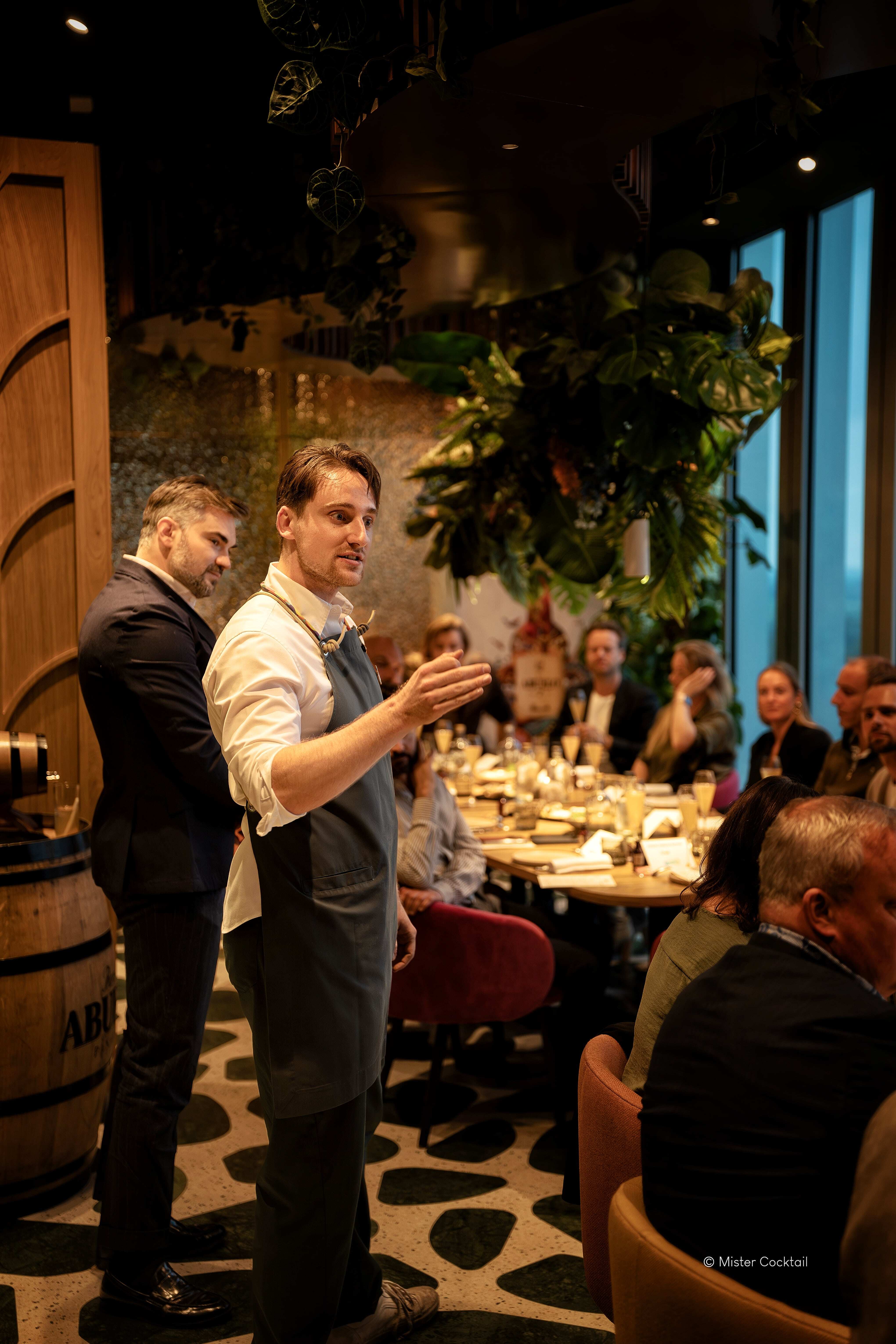 De tekst gaat verder onder de foto's. Links brand ambassador Cristóbal Srokowski die uitlegt geeft over de rum. Rechts head chef van Selva, Roberto Torres, die vertelt welke gerechten hij serveert.