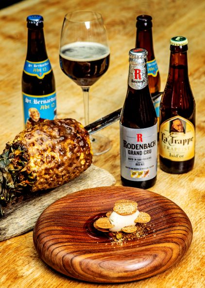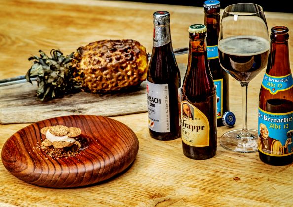 Speciaal voor de dessertspecial van Entree heeft hij pairings bedacht. “Bij onze ananas van de barbecue, met ijs van zoethout, tonkabonen en koffie kombucha adviseer ik een Abt 12 van St. Bernardus. De dadels, het bittertje en het zoet dat je proeft, doen het goed bij dit dessert. De Isi d’Or van La Trappe is een alternatief, mede door de karameltoon. Ook de Rodenbach Grand Cru is een optie. Die gaat weer goed met het frisse van de ananas.”