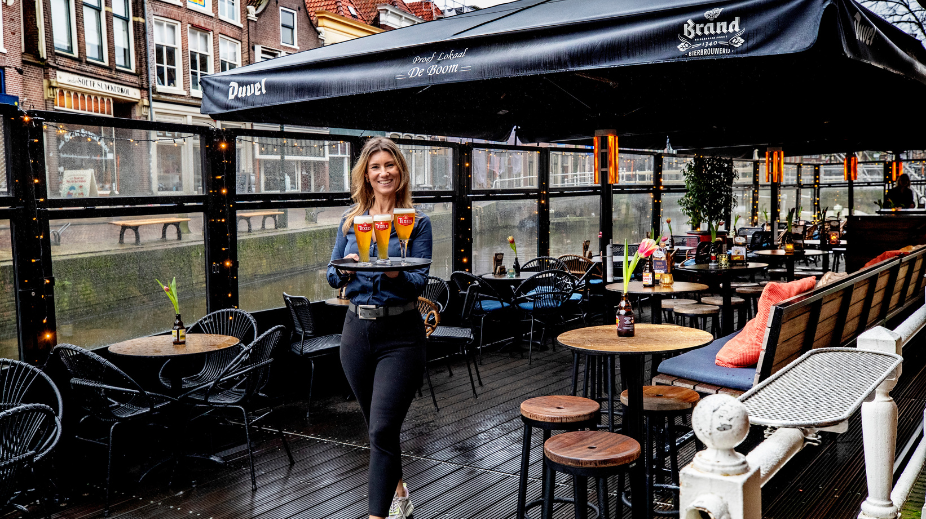 In coronatijd werd het bedrijf eigenlijk pas echt volwassen, zegt Kat. Ze kochten het pand naast hen, dat nu als opslag wordt gebruikt en legden een groot drijvend terras aan van zo’n 80 m2. Het terras is overdekt, met heaters onder de parasols en daardoor jaarrond te gebruiken. “Het is hier heerlijk zitten. In de zomer in het zonnetje, maar ook nu, in de winter.