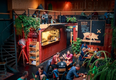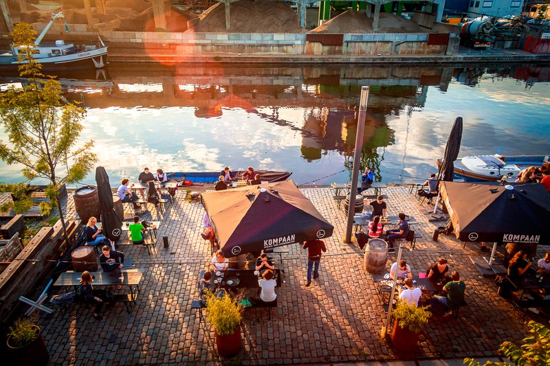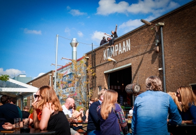“Het is onze industriële thuishaven van waaruit we alles ondernemen. We brouwen hier onze Kompaan- craftbieren in het volle zicht van de gasten. Het brouwhuis zit recht tegenover de bierbar met twintig tapkranen, die tegen een wand van zeecontainers is gemonteerd.”