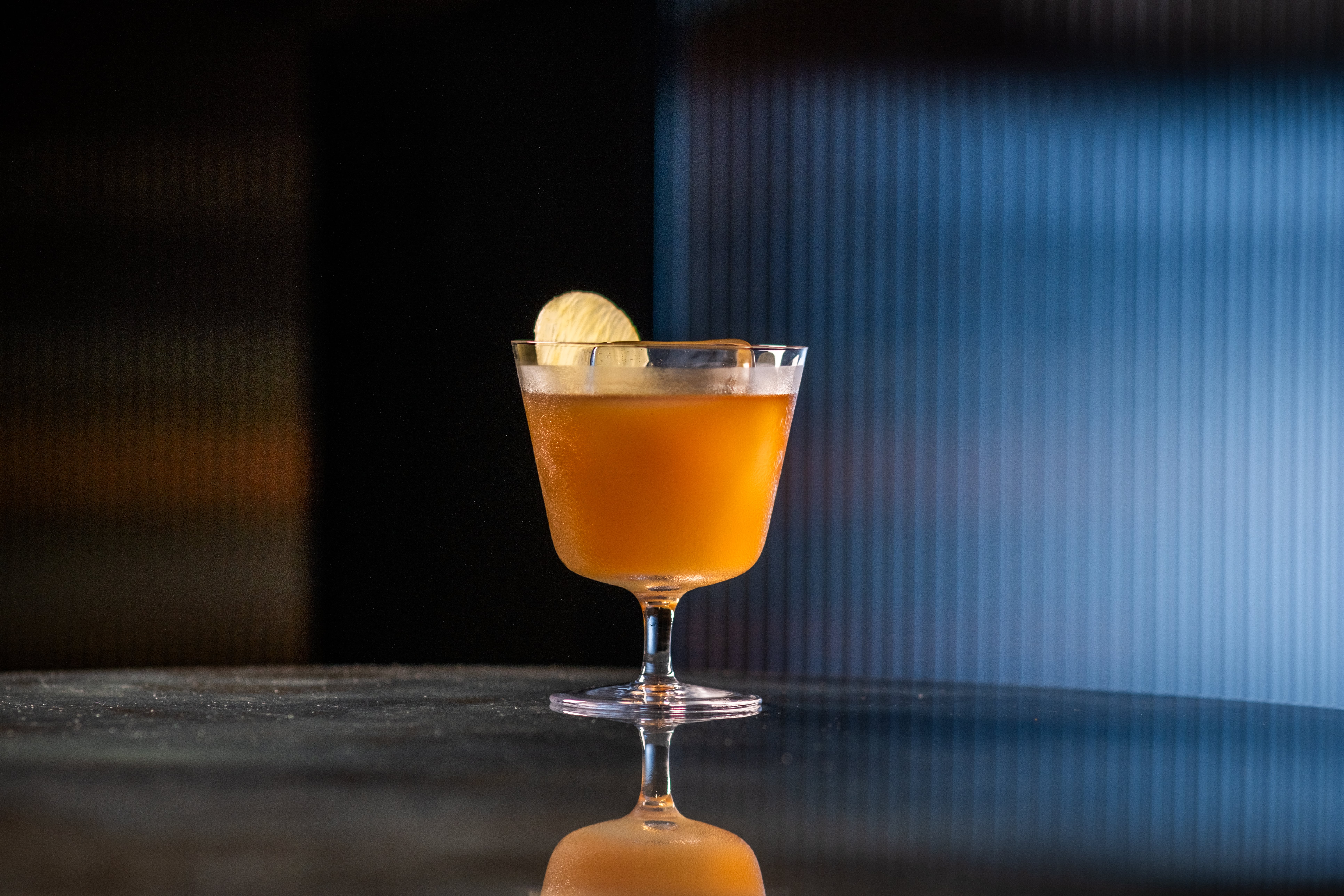 - 60 ml Michter’s Rye & Martell Noblige, fat washed met kokosolie en ananas skin
