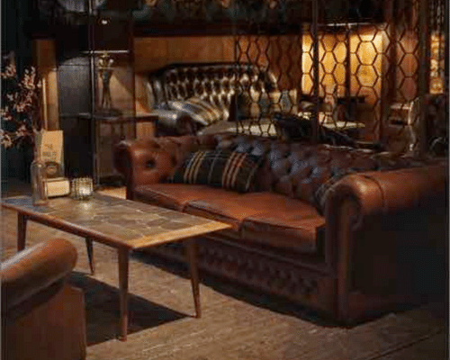 Briek: “We hebben alles opgesplitst in vier ruimtes, in een extreem warme setting. Chic maar laagdrempelig en gezellig.” Gasten betreden de pub via een grote zaal - de tavern - met comfortabele banken en een antracietkleurige bar. Via een trapje loop je naar Sally’s corner, voor koffie, een borrel of private dining. In de bibliotheek borrelen gasten tussen de hoge boekenkasten of kijken ze naar sport. In de barn staan leren chesterfields rond een antieke schouw.