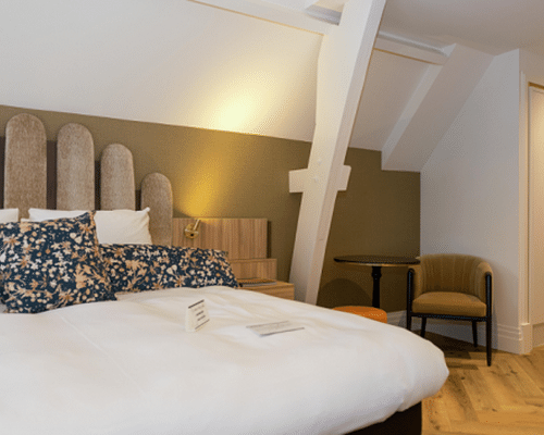 De luxueuze kamers en suites hebben uitzicht over het marktplein in Goes of over de rustige binnentuin. Verder hebben de badkamers een soundsystem en maken gasten hun eigen ‘pillow choice’. Het boetiekhotel heeft naast de dertig kamers ook een wellnesscentrum en een Grand Café.