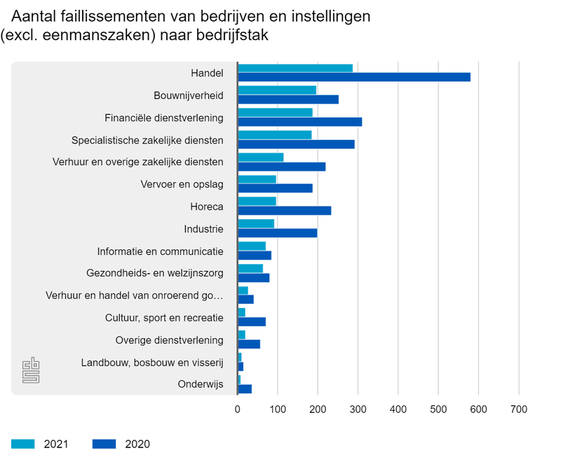 In 2021 zijn volgens voorlopige cijfers 1.536 bedrijven, exclusief eenmanszaken, failliet gegaan. Dat is het op een na laagste aantal sinds de statistieken voor het eerst bijgehouden werden in 1981. In 1990 werden er nog minder faillissementen geteld, namelijk 1.527. Het aantal faillissementen daalde in alle sectoren. De meeste bankroeten werden uitgesproken in de handel. Dit is logisch, aangezien de handel ook de sector is met de meeste bedrijven.