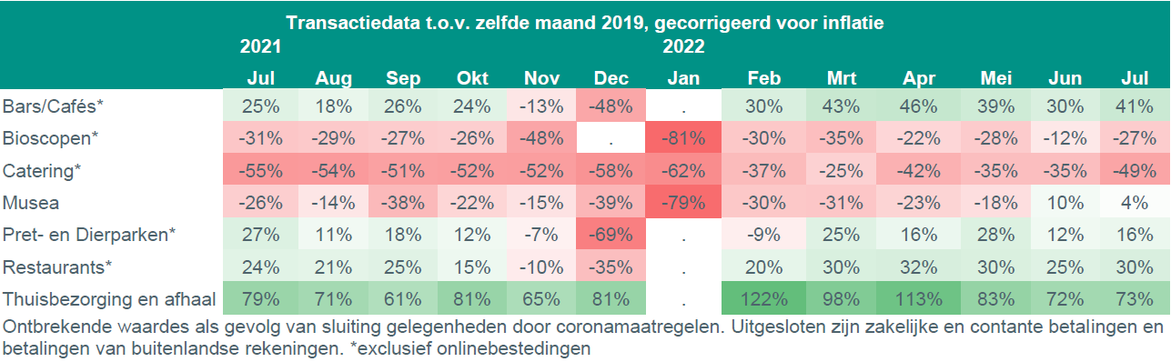 Zo gaven Nederlandse consumenten in juli nog steeds meer geld uit in cafés en restaurants en aan musea, attractieparken en dierentuinen dan in juli 2019. Alleen bioscopen en catering zitten nog niet op het niveau van voor de coronacrisis.