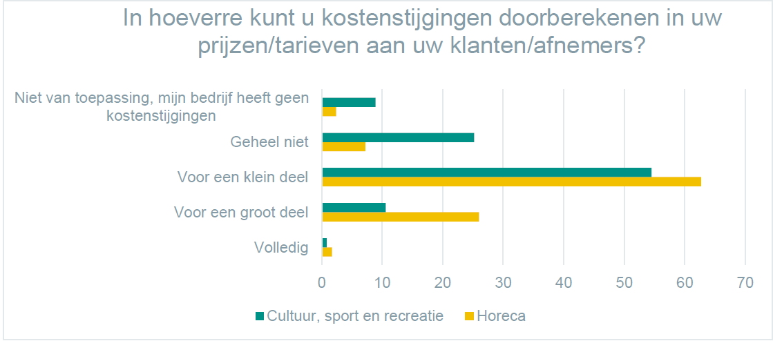 Een kwart van de ondernemingen in de cultuur, recreatie en sport – branches die CBS heeft samengevoegd tot een sector (zie onderstaand figuur) – geeft aan de gestegen kosten aan energie, inkoop van voeding, personeel, en transport geheel niet te kunnen doorberekenen aan hun klanten en bijna 55 procent kan dit slechts voor een klein deel. Van de ondernemers in de horeca geeft slechts 7,2 procent aan de kosten niet te kunnen doorberekenen, al zegt ruim 62 procent dit maar voor een klein deel te kunnen.