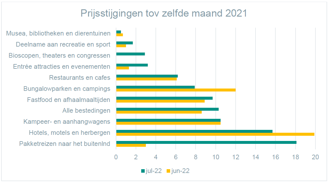 Het moeilijk kunnen doorberekenen van de gestegen kosten door musea, dierentuinen, bioscopen, theaters en organisatoren van congressen blijkt uit de geringe prijsstijgingen in deze branches. Deze waren in juli niet hoger dan 3 procent. Een vergelijking met andere branches en de totale inflatie van 10,3 procent laat zien dat dit geen grote toename is. Kampeerwagens (10,5 procent), hotelkamers (15,7 procent) en pakketreizen naar het buitenland (18,1 procent) zijn daarentegen in de afgelopen maand fors in prijs gestegen. Ook fastfood en afhaalmaaltijden zijn flink duurder geworden met een stijging van 9,7 procent in juli. Restaurants en cafés hadden meer moeite de gestegen kosten volledig door te berekenen; hier stegen de prijzen in juli met 6,2 procent.
