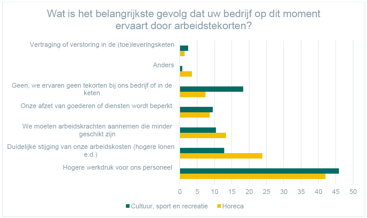 Naast de stijgende kosten zorgen personeelstekorten voor een afnemend vertrouwen van ondernemers. In de horeca stonden in het tweede kwartaal 44.600 vacatures open; een toename van 3.000 vacatures ten opzichte van het eerste kwartaal. Horecaondernemingen in West-Nederland nemen met 23.400 vacatures meer dan de helft voor hun rekening. De personeelstekorten vormen een groot probleem. Zo geeft 42 procent van de horecaondernemers aan dat door het personeelstekort het personeel hoge werkdruk ervaart en bijna 24 procent merkt dat de arbeidskosten – lees: vooral de lonen – duidelijk zijn gestegen.