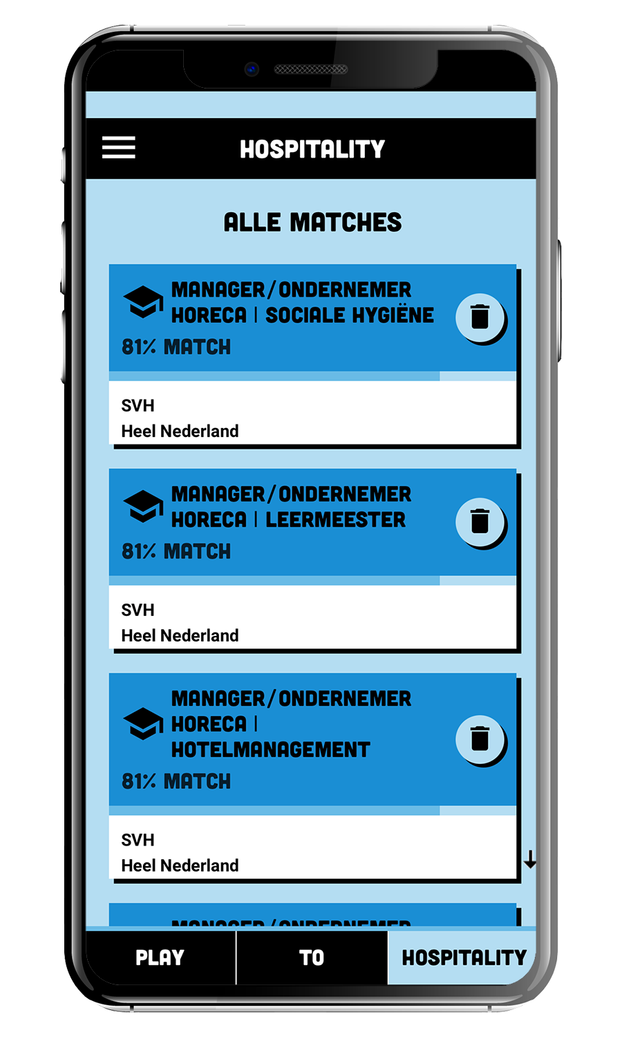 Skills matchen wordt steeds belangrijker op de arbeidsmarkt. Vaak zijn het dure trajecten om in kaart te brengen wat een medewerker al beheerst of juist nog moet aanleren. De app Play to Hospitality is gratis en hierin draait het letterlijk om games. Door de spellen te spelen krijgt de medewerker inzicht in de eigen soft skills zoals persoonlijkheid en gedrag. Voor een prijs van € 9,50 kan de medewerker advies krijgen wat hij of zij qua verdere ontwikkeling moet doen om aan de eisen van een functie of een vacature te voldoen.