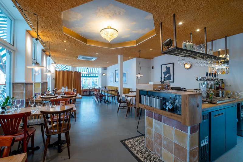 "Toen we bij onze collega’s van Café Franklin en Walter Benedict zagen wat een akoestisch plafond kon doen voor de demping, hebben we besloten om de zaak leeg te halen, drie dagen dicht te gaan en het plafond te laten behandelen met een akoestische spray, die toevallig in de kleur okergeel verkrijgbaar was, waardoor het perfect past in ons interieur.”