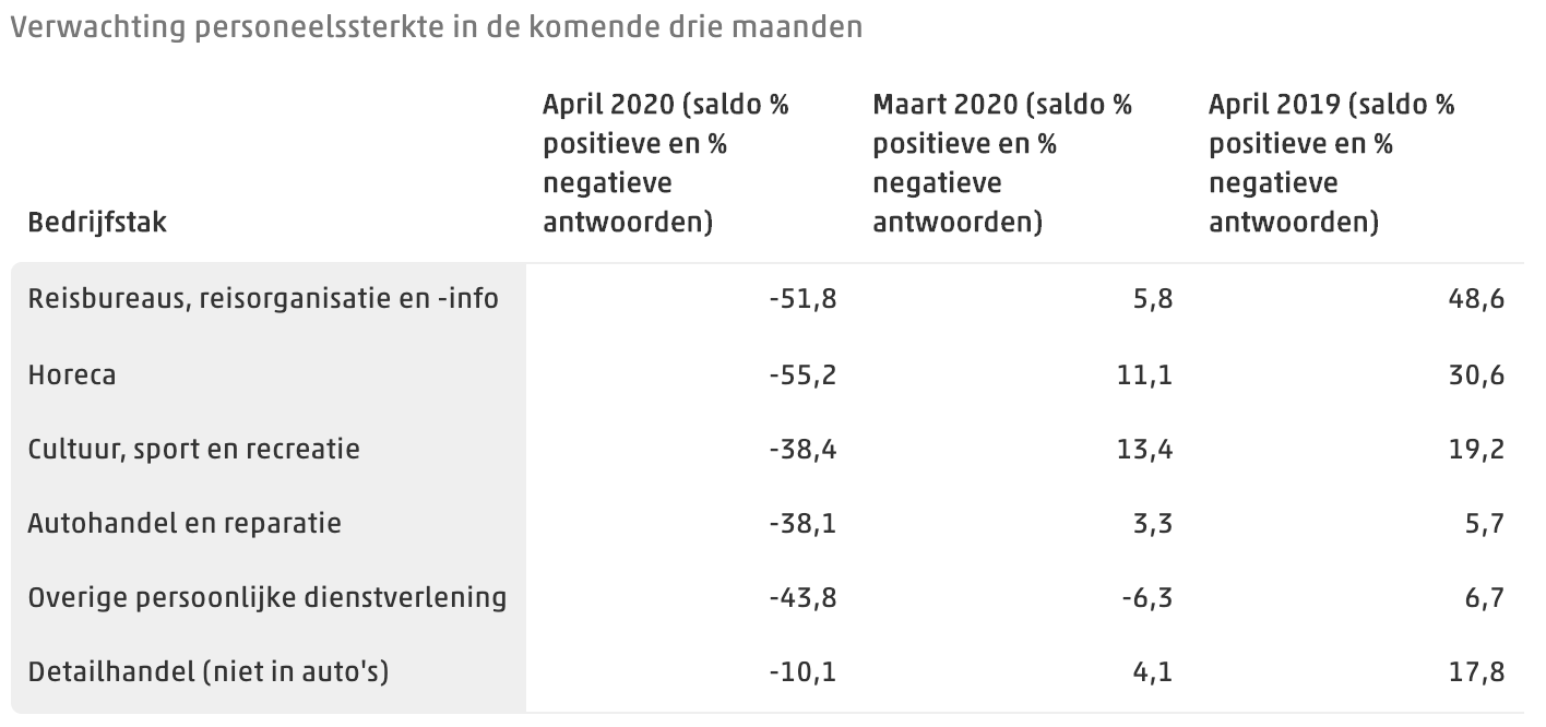 Naast de lagere omzet verwachtten in april veel ondernemers ook dat hun personeelssterkte gaat afnemen in het tweede kwartaal. Een maand eerder waren ondernemers per saldo nog positief over de verwachte personeelssterkte. In de horeca denkt per saldo meer dan de helft van de ondernemers met minder personeel te werken. Ook in de reisbranche verwacht circa de helft krimp van het personeelsbestand.