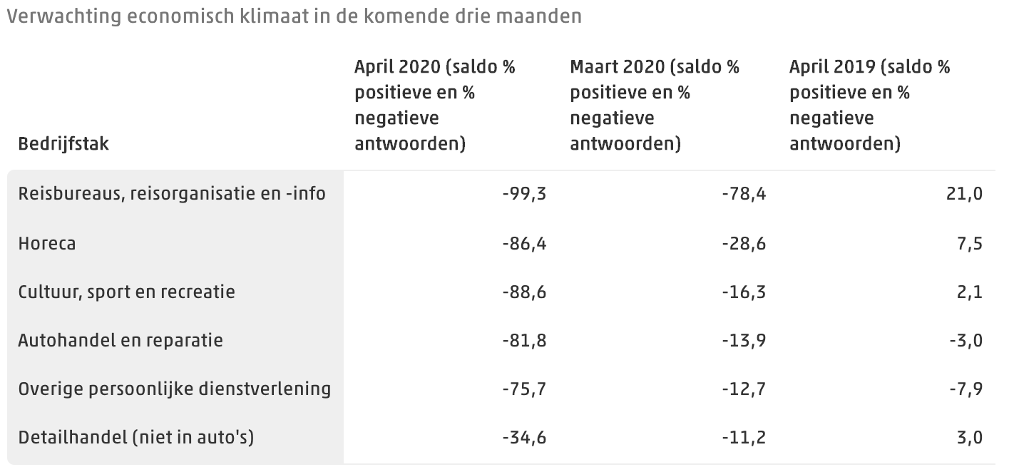 In april waren er wederom meer ondernemers in consumentgerichte bedrijfstakken die verwachtten dat het economisch klimaat gaat verslechteren dan die aangaven te verwachten dat het gaat verbeteren. Per saldo waren er in april beduidend meer negatief gestemde ondernemers dan in maart 2020. Op 12 maart en in de weken daarna zijn ingrijpende maatregelen tegen de verspreiding van het coronavirus van kracht geworden.