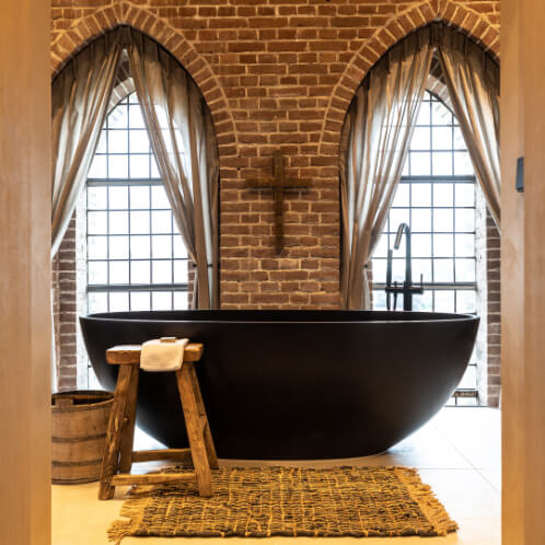 In deze voormalige ‘galmkamer’ is nu de hotelsuite ingericht, topdesigner Piet Boon was bij het ontwerp betrokken. Het resultaat is zeer stijlvol en je voelt je er direct thuis. In de ruimte onder de suite is een tot in de puntjes afgewerkte badkamer, voorzien van toilet, dubbele douches, dubbele wastafels en een uniek bad-met-uitzicht.