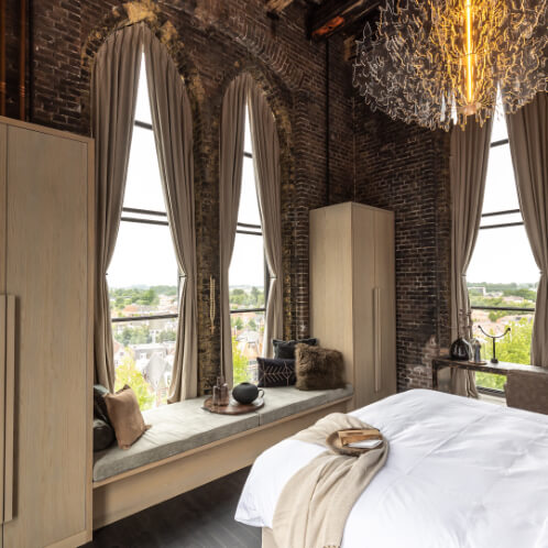De opening van The Clock Tower Suite is het sluitstuk van de metamorfose die de Laurentiuskerk heeft ondergaan. In april 2014 werd hier de allerlaatste mis gehouden, sinds 2020 zijn er onder meer een yogastudio en een bierbrouwerij met proeflokaal gevestigd, waardoor het beeldbepalende kerkgebouw met zijn fraaie glas-in-loodramen en zijn bijzondere verhalen kon worden behouden. De kerk stamt uit 1876, de toren uit 1900. De historie van dit bouwwerk voel je als je de wenteltrap opgaat, 155 treden omhoog naar de plek waar tot 2018 drie bronzen luidklokken hingen.