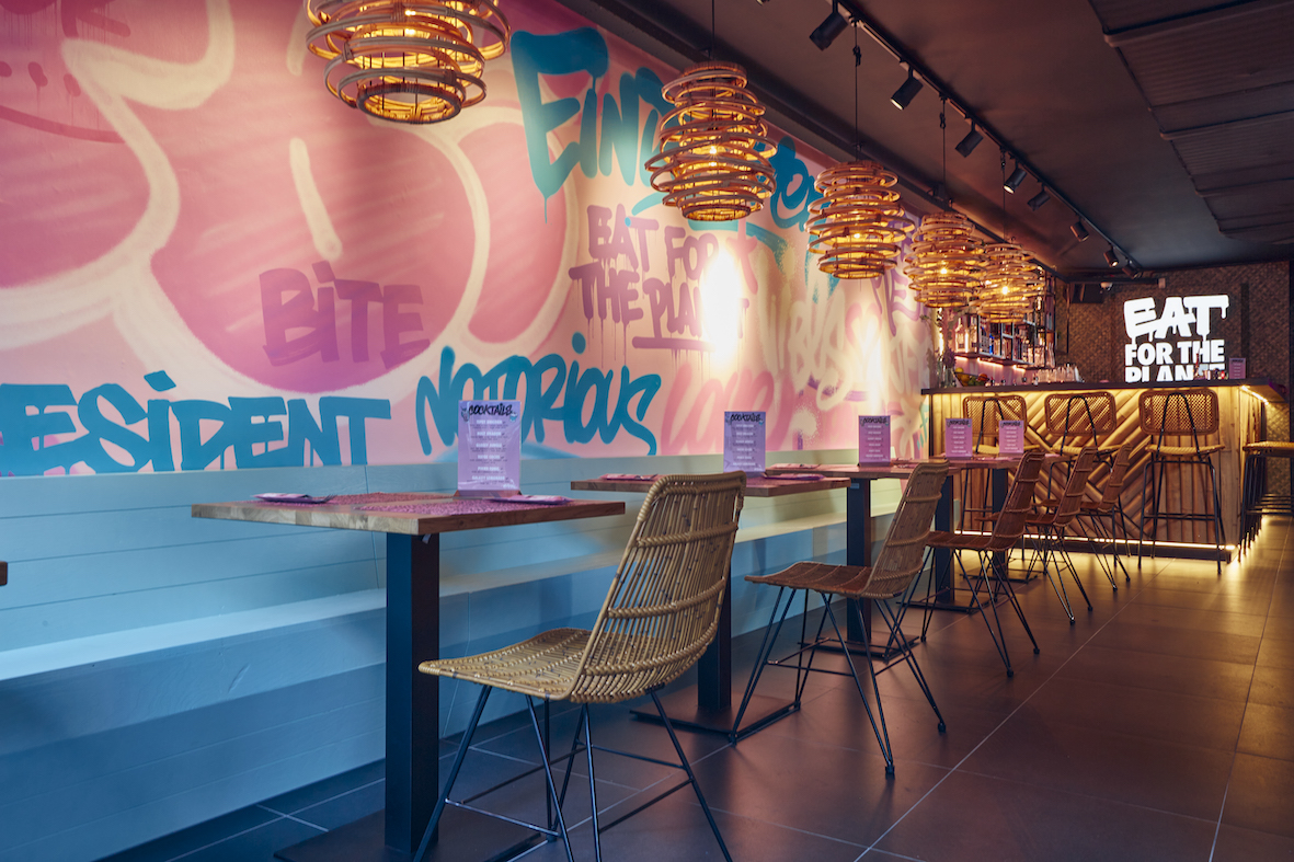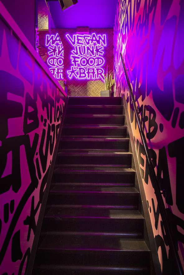 Iedere zaak krijgt wel een eigen ambiance. “De street art vibe komt overal terug, maar zal altijd verschillen van bar tot bar”, legt hij uit. “De ene keer overheersen mint-tinten, de andere keer zie je wat meer roze. Het is geen plant based eenheidsworst.” In Barcelona, de ‘flagshipstore’, bleek dat al: daar vormt een catwalk de entree van de zaak. “Een tunnel die helemaal gebrand is in de Vegan Junk Food Bar-stijl, met grafitty art. Dat vinden gasten een geweldige plek om foto’s te maken.”