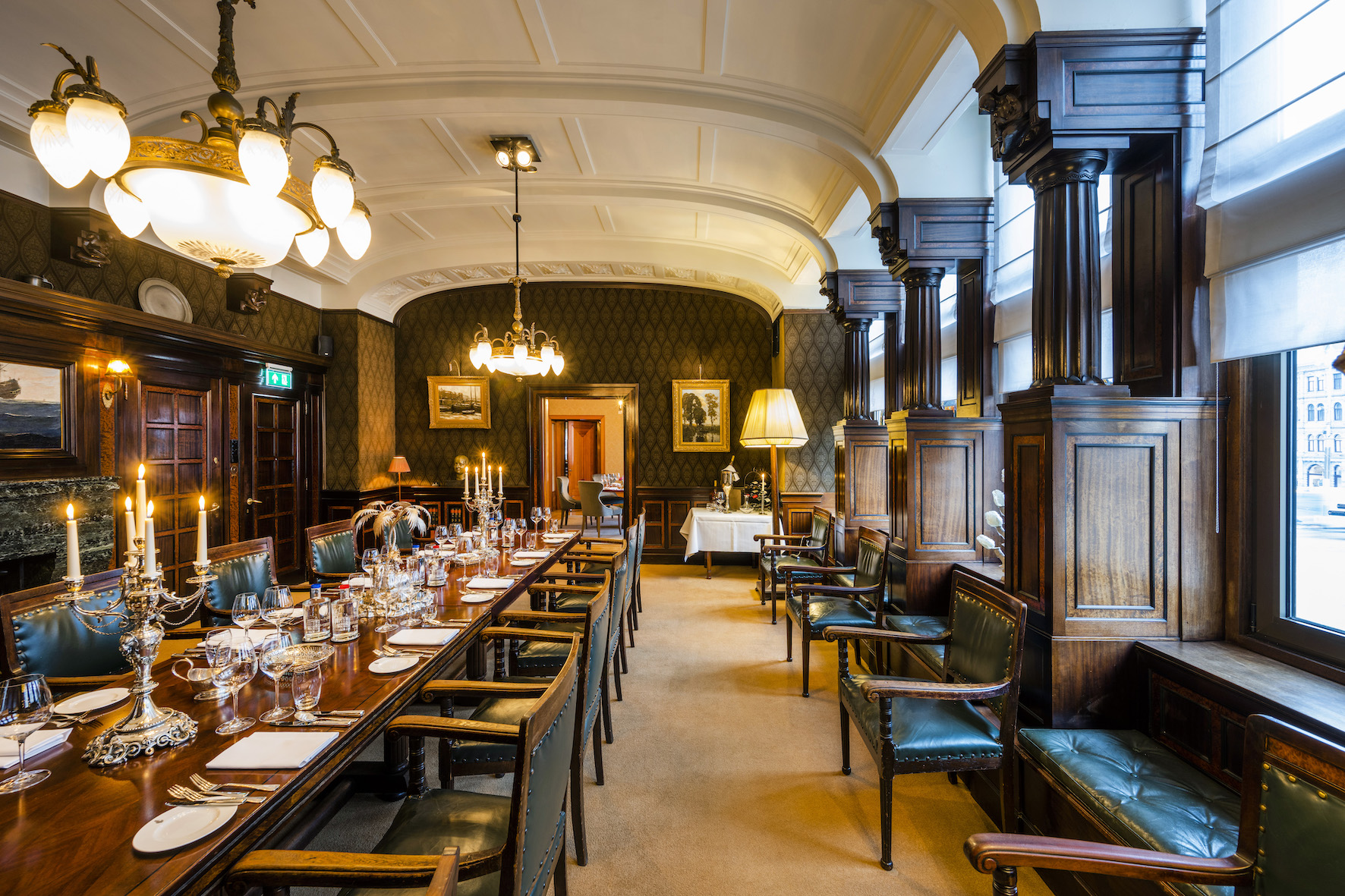 “Gasten zien onze meerwaarde en dat is vooral: onderscheidend in kwaliteit”, verklaart Francke die groeiende belangstelling. Vanaf het moment dat hij aantrad, is dat zijn focus. Hij legt de lat hoog en liefst iedere dag hoger. “Alles draait om het bieden van een mooie totaalbeleving aan onze leden en gasten en dat realiseren we met een hoog kwaliteits- en serviceniveau, een inhoudelijk sterk activiteitenprogramma, een toplocatie en hoogwaardige f&b.” We lopen van de bestuurskamer via de bibliotheek met plafondhoge massief kersenhouten vitrinekasten, de dameskamer en de bar, naar het à-la-carterestaurant. Op deze verdieping is alles alleen toegankelijk voor leden. In het restaurant, twee eyecatchers: eikenhouten vitrinekasten met zilverwerk, dat vroeger diende als tafelstuk voor als de gesprekken stilvielen. “Uit de kluis gehaald en gerestaureerd tijdens de renovatie”, vertelt Francke. “Paul Linse (Studio Linse), die het eigentijds-chique interieur voor dit restaurant ontwierp, maakte er deze kasten voor.”
