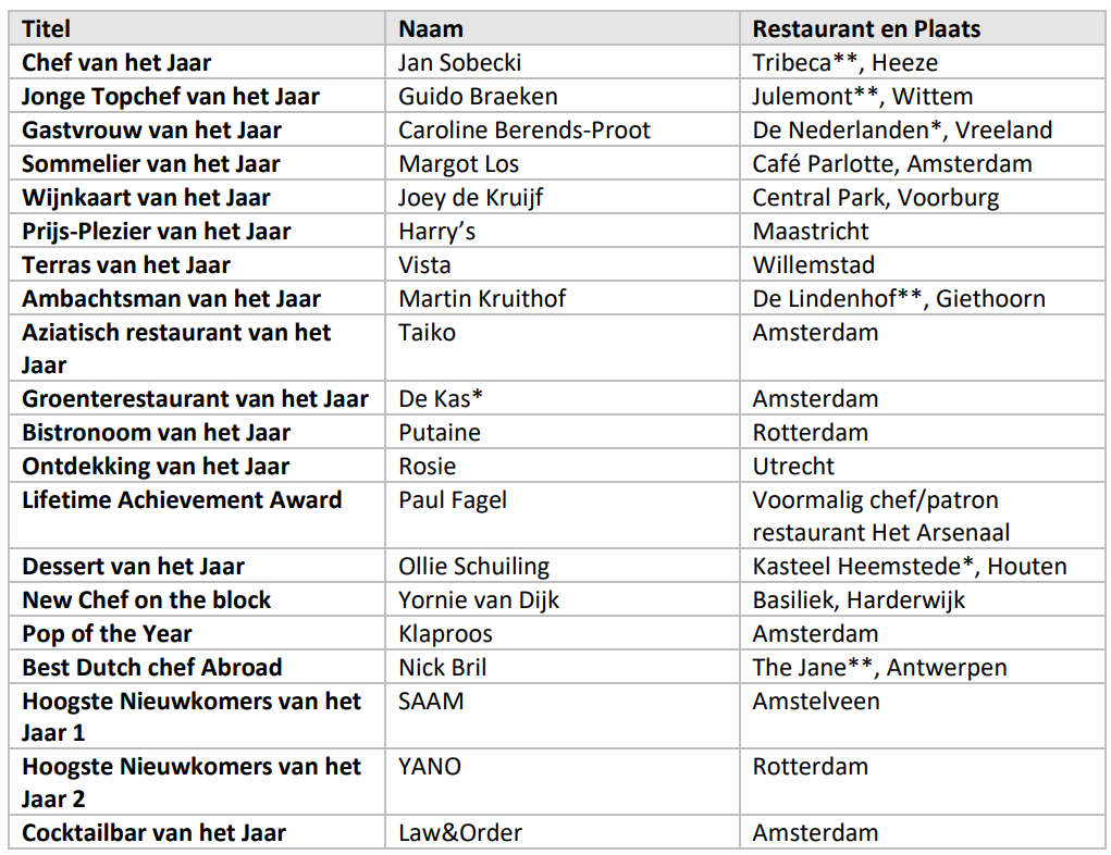 Gedurende de lancering namen maar liefst 20 winnaars in 19 categorieën een Award in ontvangst. De award voor ‘Chef van het Jaar’ ging dit keer naar Jan Sobecki van Tribeca** in Heeze. Hij werd geprezen voor brandende ambitie en evenwichtige smaakcombinaties. "Het is fantastisch om samen met Claudia de zaak te runnen. Ik had niemand anders aan mijn zij willen hebben. We hebben met Tribeca veel plannen voor de toekomst. We gaan verbouwen. Op dit moment hebben we al een chef's table, maar dit willen we verder doortrekken in ons restaurant", vertelt Sobecki op het podium.
