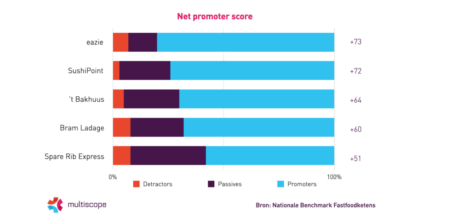 De Europese Net Promoter Score (NPS) meet de klanttevredenheid van bezoekers. Fastfoodketens scoren gemiddeld een NPS van +30. Dertien ketens hebben een NPS boven het gemiddelde van de markt en acht ketens hebben een NPS onder het marktgemiddelde.