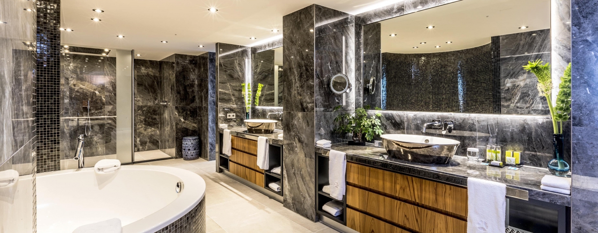 Links: de lounge van Ciel Bleu**, rechts: het uitzicht vanuit het restaurant over Amsterdam