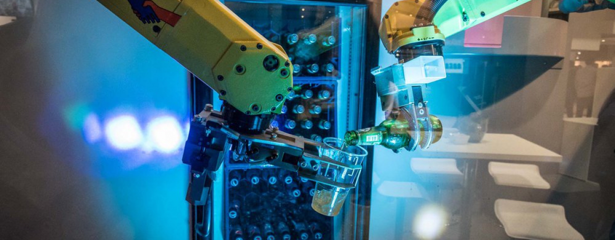 In 2015 ging een video viraal waarin een bedrijf uit Twente liet zien hoe twee robots een flesje bier uit de koelkast trokken, de kroonkurk eraf haalden en een mooi schuimend glas bier serveerden. Deze zomer beloofde Heineken een bierrobot die (in de tuin of op een festival) een biertje kon komen brengen. Robots spreken tot de verbeelding, maar lijken tot dusver vooral de hobby van een stel ingenieurs of een paar marketeers. Toch zien we de drankrobot de horeca insluipen.