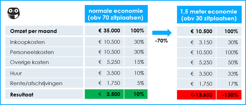 In de horeca zijn de hoge directe kosten voor inkoop en vooral personeel nauwelijks terug te schroeven. En voor de indirecte kosten is de ondernemer vaak afhankelijk van de goodwill van externe partijen. Het volgende simpele rekenvoorbeeld laat zien dat elke euro omzet de horecaondernemer 1,3 euro kost. Rekenvoorbeeld: een gemiddeld café-restaurant met 100% full-service concept en 70 zitplaatsen haalde voor de Coronacrisis een gezond rendement van 10% bij een omzet van €35.000 per maand (€420.000 per jaar). Door de 1,5 meter economie heeft dit restaurant ineens geen 70 maar slechts 30 zitplaatsen. Minder zitplaatsen in combinatie met een laag consumentenvertrouwen leiden tot een letterlijke en figuurlijke kaalslag in de horecasetting met een in verhouding lage omzet. Het resultaat is een verlies van bijna €14.000 per maand. Dit betekent dat een gemiddelde ondernemer met een full-service restaurant met de 1,5 meter afstand regels circa 130% verlies gaat maken. Op elke euro die de ondernemer verdient, moet deze 1,3 euro toeleggen.