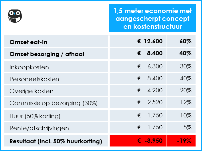 Ondanks het inspelen op omzetkansen en het waar mogelijk verlagen van kosten, is het voor een ondernemer onmogelijk om zwarte cijfers te draaien. De directe kosten (inkoop en vooral personeel) in de horeca zijn hoog, hebben de meeste impact en kunnen maar beperkt worden teruggebracht. Inkoop is gelukkig variabel van aard. Maar qua personeelskosten zijn een kok en bedieningsmedewerker keihard nodig om de deuren open te houden. Voor het besparen op de indirecte kosten (overige kosten, huur en andere kapitaalslasten) is de ondernemer grotendeels afhankelijk van de goodwill van externe partijen. Alleen ondernemers met voldoende reserves zullen de 1,5 meter economie een tijdje kunnen overleven.