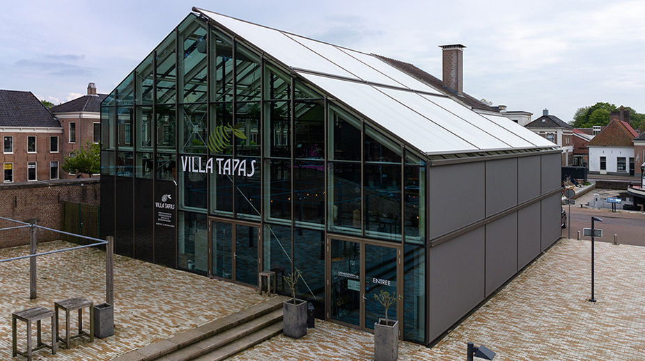Gelegen in het centrum van Assen, in het noorden van de provincie Drenthe, doet het glazen gebouw van restaurant Villa Tapas denken aan een buitengewoon groot, modern glazen gebouw. Ongeveer 170 m2 glas geven het gebouw een transparant karakter. Deze constructiemethode bracht echter ook nadelen met zich mee. Namelijk te hoge kamertemperaturen in de lente, zomer en herfst. Zonweringssystemen van fabrikant markilux hebben dit probleem opgelost, waardoor nu minder energie nodig is om het interieur van het restaurant te klimatiseren.