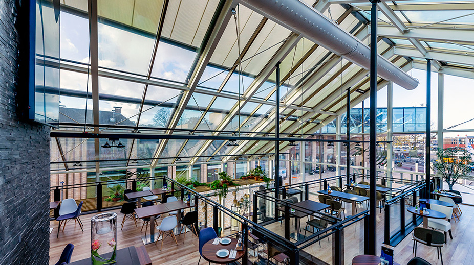 Volgens Jan Kattenbeck, hoofd van "markilux project", de projectafdeling van de zonweringspecialist, zette de restaurantexploitant in 2018 een eerste stap om het glazen dak op het westen te laten beschaduwen. Op een oppervlakte van 166 m2 hebben ze zeven deels-gekoppelde bovenglas-serrezonweringen gemonteerd. “Met de nieuwe zonwering kan de binnenkomende warmte in het gebouw worden verminderd", legt Kattenbeck uit. Door te kiezen voor een lichtgekleurd zonweringdoek past het zonweringsysteem onopvallend in het algehele uiterlijk van de locatie. Deze zonwering voor het gebouw was echter nog niet voldoende. Daarom werd in een volgende stap de hele westelijke glazen façade voor begin 2022 van screens voorzien.