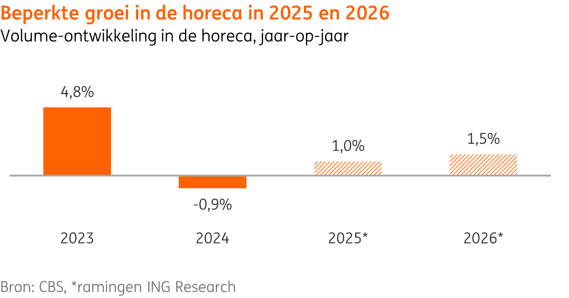 De verwachte volumegroei voor de horeca is met 1% dit jaar en 1,5% in 2026 gematigd positief. Door een combinatie van hogere lonen en lagere inflatie geeft de consument zowel dit jaar als volgend jaar naar verwachting meer uit in de horeca dan in 2024.