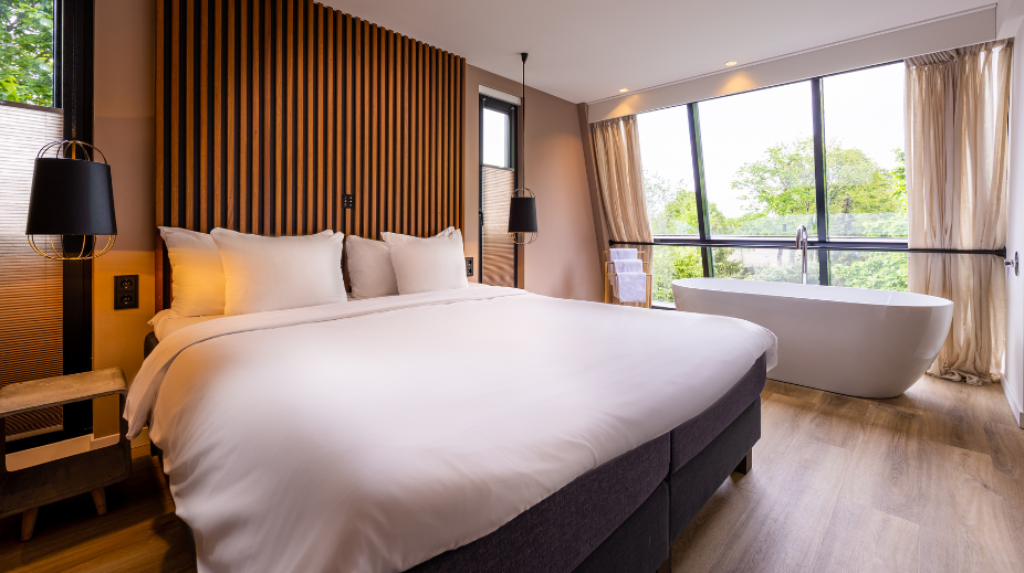 "Onze focus ligt op duurzaamheid. Dat verwachten onze gasten ook. We bevinden ons op de Veluwe; de natuur is onze kracht. Daar moeten we goed voor zorgen. Als de deuren van hotelkamers openstaan, schakelt de verwarming automatisch uit. We hebben dezelfde linnenleverancier als omliggende hotels, zodat er maar één vrachtwagen deze kant op hoeft te rijden. Bovendien zijn we aangesloten bij Hotels for Trees. Als gasten hun kamerschoonmaak overslaan, plant deze organisatie hier een boom voor. In totaal zijn dat nu al zo’n 1170 bomen. We hopen ons dak nog te vervangen en vol te leggen met zonnepanelen."