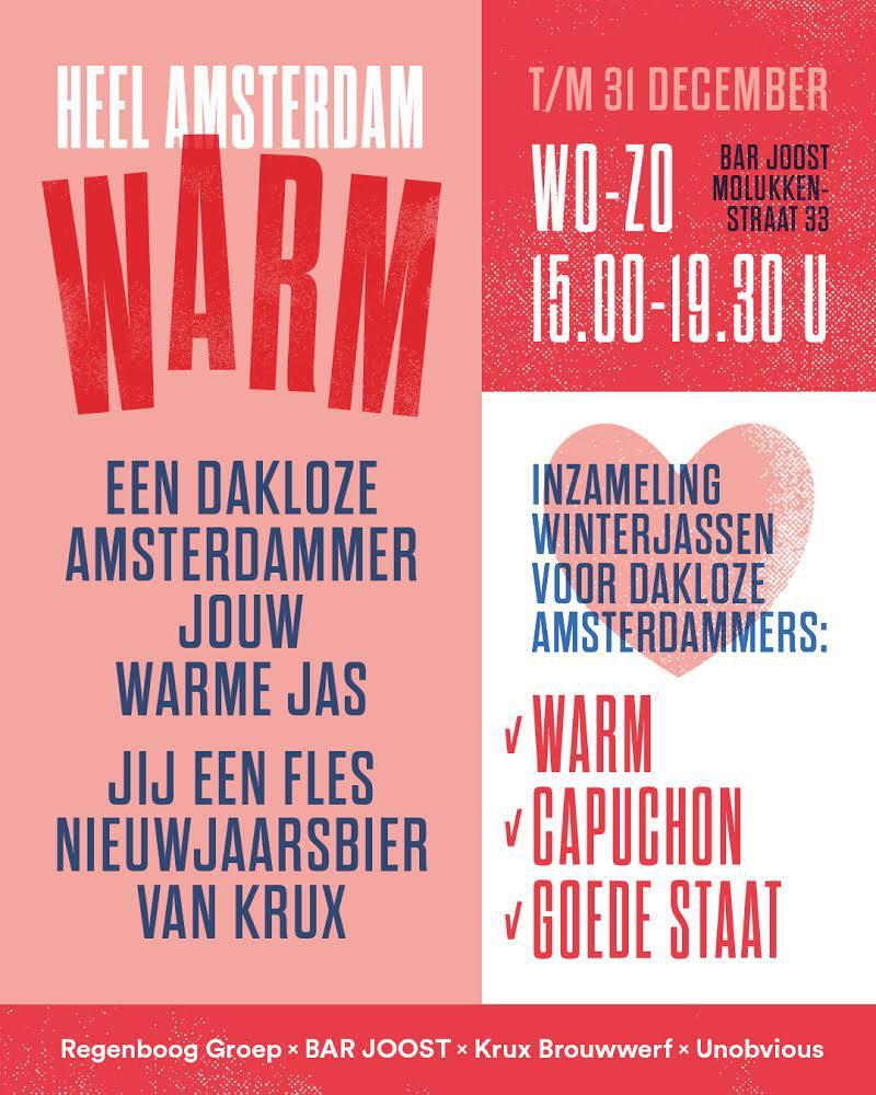 Oproep horecaondernemers regio AmsterdamBar Joost aan de Molukkenstraat 33 in Amsterdam is de eerste locatie waar gevers de winterjassen kunnen inleveren. Maar de initiatiefnemers willen graag de actie verder uitbreiden en horecaondernemers uit meerdere stadsdelen hierbij betrekken.