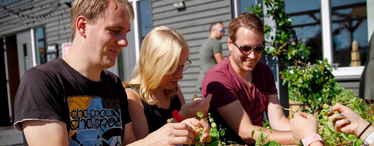 ’s Morgens wordt de hop geoogst en worden de 4-5 meter lange hopstrengen naar de brouwerij gebracht. Samen met vrijwilligers die de hopplanten in het park onderhouden worden de hopbellen vervolgens aan lange tafels van de strengen geplukt en in bakken klaargezet.