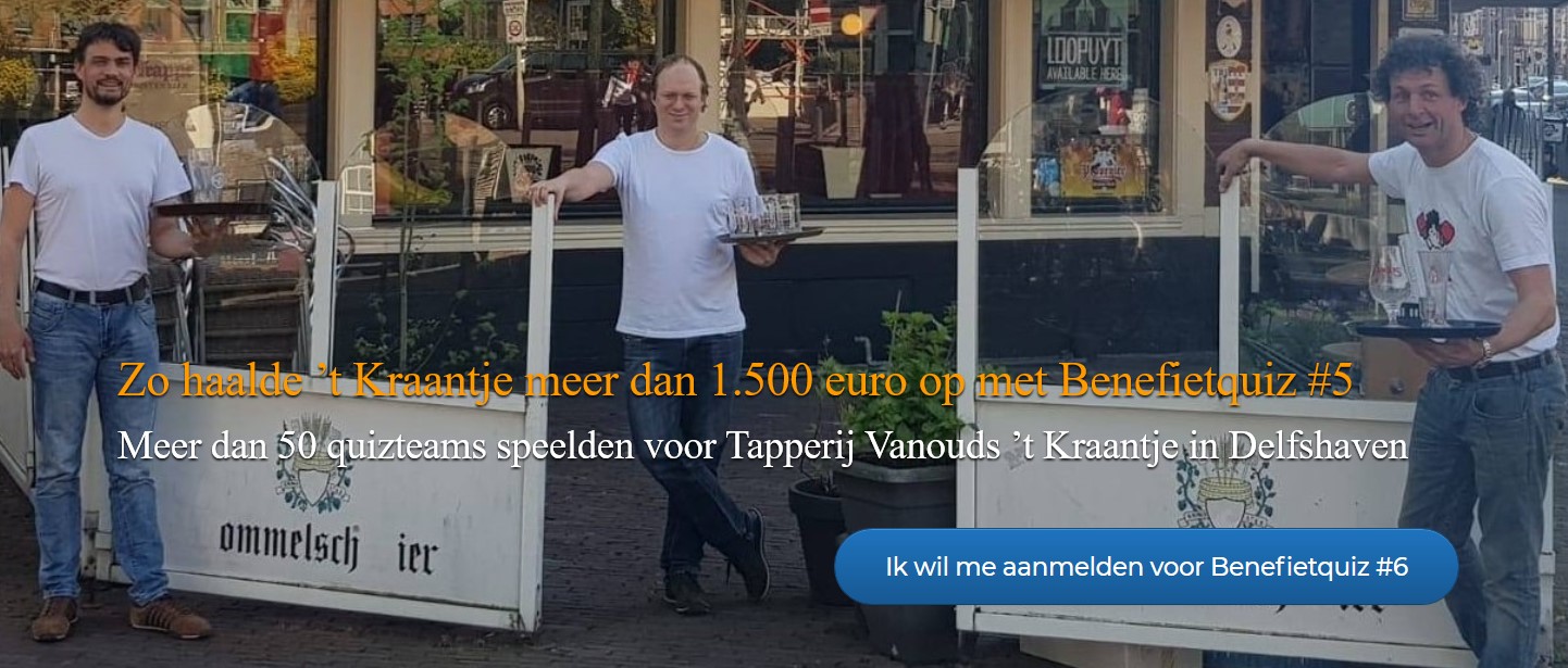 Een voorbeeld. Maurice, eigenaar van Tapperij ’t Kraantje in Delfshaven, stuurde een link van de Benefietquiz naar een aantal vaste gasten via whatsapp. Dit werd vervolgens gedeeld door zijn trouwe gasten en leidde tot meer dan vijftig donaties! Een totaalbedrag van meer dan vijftienhonderd euro werd gedoneerd door mensen die ’t Kraantje willen steunen in deze moeilijke periode voor de horeca.