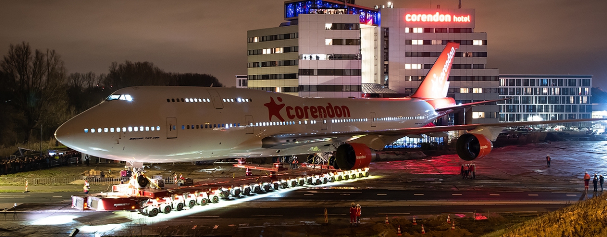 Dinsdagnacht begon de laatste reis van de Boeing luchthaven Schiphol. Het ontmantelde toestel werd op een trailer van gespecialiseerd transportbedrijf Mammoet geplaatst om de 12,5 kilometer naar het hotel te kunnen afleggen. Daarbij moest het vliegtuig 17 sloten, snelweg A9 en een provinciale weg oversteken. De A9 werd in de nacht van vrijdag op zaterdag succesvol overgestoken. In de nacht van zaterdag op zondag stak het transport de Schipholweg over om daarna met 57 bewegingen achteruit in te parkeren in de hoteltuin. Het spectaculaire transport trok wereldwijd de aandacht en werd door nationale en internationale media gevolgd.
