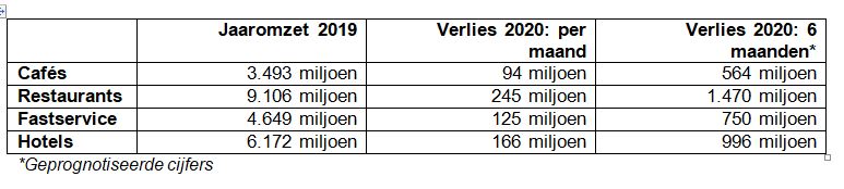De uitkomsten geven inzicht in de impact per regio, maar ook per type bedrijf. Op landelijk niveau is de onrust inmiddels groot. Op dit moment zien we dat vooral Brabant en Amsterdam zwaarder zijn getroffen, maar met de nieuwe maatregelen zien we dat de zorgen bij horecaondernemers uit andere regio’s ook snel toenemen. Het omzetverlies voor maart wordt geschat op 33% (ofwel € 630 miljoen) en zal toenemen naar € 700 miljoen per maand, als de rest van Nederland de patronen van Brabant en Amsterdam volgt. Met inachtneming van de jaaromzet 2019, is het verwachte omzetverlies per maand en half jaar en jaar als volgt: