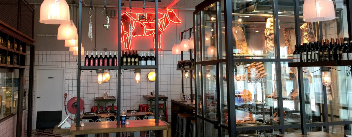 Dat schrijft DUIC. Speck Bar & Grill is een op een slagerij geïnspireerd restaurant aan het Ledig Erf waar, de naam zegt het al, vlees centraal staat. De eigenaren richtten het nieuwbouwpand zélf in. De absolute eyecatcher is de rijpingskast waarin grote stukken vlees hangen. "Vlees is een prachtig product en we hadden al langer het idee daaromheen een concept te verzinnen. Een restaurant als dit bestond in Utrecht nog niet", vertelden Visser eerder aan Entree.