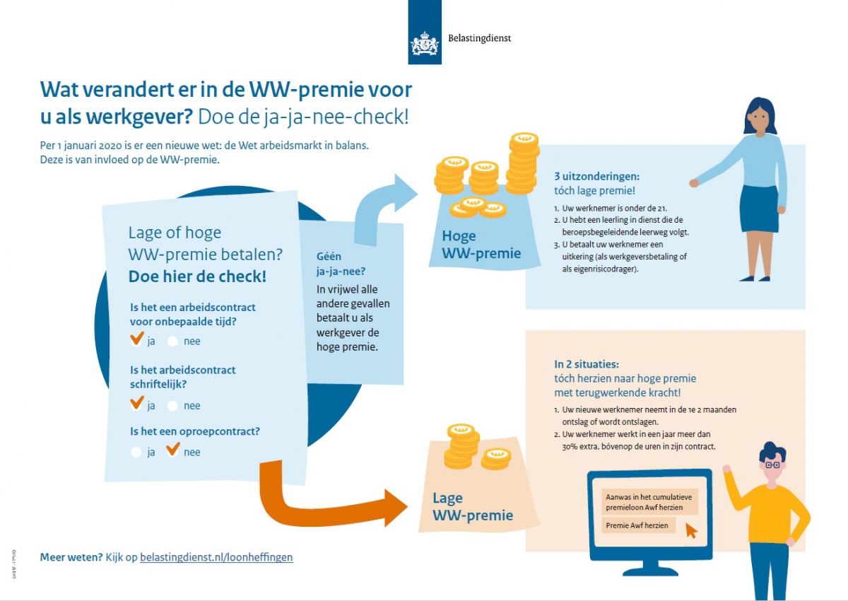 Sinds 1 januari 2020 is de nieuwe Wet arbeidsmarkt in balans (WAB) van kracht. Deze wet heeft invloed op de WW-premie die werkgevers betalen. Voor werknemers met een vast arbeidscontract betalen werkgevers in de meeste gevallen de lage WW-premie, voor overige werknemers de hoge WW-premie. Bij arbeidscontracten voor onbepaalde tijd mag de lage WW-premie alleen toegepast worden wanneer het contract geen oproepcontract is, schriftelijk is vastgelegd en ondertekend is door zowel werkgever als werknemer. Bij arbeidscontracten die uiterlijk 31 december 2019 zijn ingegaan, kan het zijn dat deze alsnog schriftelijk moeten worden vastgelegd.