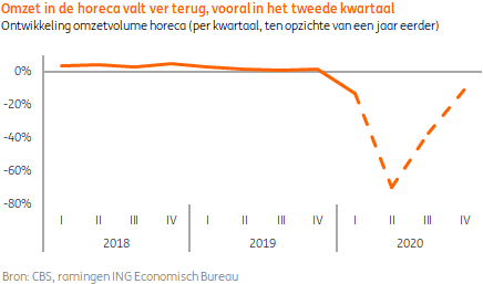 De omzet in de horeca blijft ook in de tweede helft van 2020 last houden van de coronamaatregelen, de veranderde consumentenvoorkeuren en de neergang van de economie. Het horeca-aanbod is nog beperkt door de anderhalve meter voorschriften, de sluiting van discotheken tot minimaal 1 september en het uit- en afstel van evenementen. Ook gelden er voor veel reizigers uit landen buiten de EU, zoals uit de VS, nog inreisverboden voor onbepaalde tijd. Verder blijft een deel van de Nederlandse gasten uit voorzorg weg en is er veel minder animo bij buitenlandse toeristen om in Nederland te verblijven. Het gemis van buitenlandse gasten wordt wel gedeeltelijk gecompenseerd doordat meer Nederlanders in eigen land blijven. Ten slotte zorgen de oplopende werkloosheid en de economische onzekerheid dat consumenten eerder bezuinigen op zaken als horecabezoek.