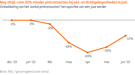 Het absolute dieptepunt voor de horeca lag in april. Hotels ontvingen in die maand slechts 5 procent van het gebruikelijke aantal gasten. Aangezien normaal gesproken meer dan de helft van het aantal hotelgasten uit het buitenland komt, is de heropening van Europese binnengrenzen een belangrijke eerste stap in het herstel. Restaurants en cafés mochten door de coronamaatregelen tijdelijk geen gasten ontvangen. De ontwikkeling van het aantal pintransacties geeft een indicatie van de impact die dit heeft gehad. Het aantal pintransacties bij eet- en drinkgelegenheden lag in april bijna 70 procent lager dan een jaar eerder blijkt uit betaaldata van ING. Inmiddels is er weer meer mogelijk dan alleen het afhalen en bezorgen van maaltijden en is het aantal pintransacties deels opgekrabbeld. In juni lag het totale aantal transacties nog 33 procent onder het niveau van 2019.