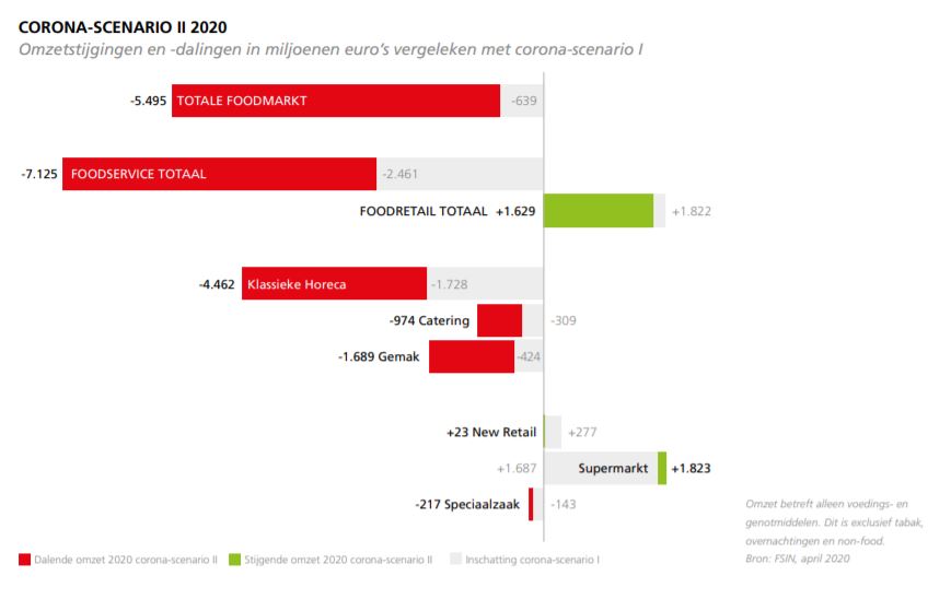 Hoe hard de economie als gevolg van het coronavirus wordt geraakt, hangt af van hoe lang de maatregelen om verspreiding van het virus tegen te gaan, in stand blijven. Hoe langer de maatregelen duren, hoe dieper de economische recessie zal zijn en hoe langer het duurt voor we weer op het oude niveau zitten. Ook neemt de onzekerheid onder consumenten sterk toe, wat leidt tot ander consumentengedrag. Foodservice krijgt de hardste klappen: in totaal gaat er €7,1 miljard weg, waarvan de horeca met een min van 41,5% de hardste klappen krijgt. Supermarkten profiteren met een omzetstijging van €1,8 miljard.