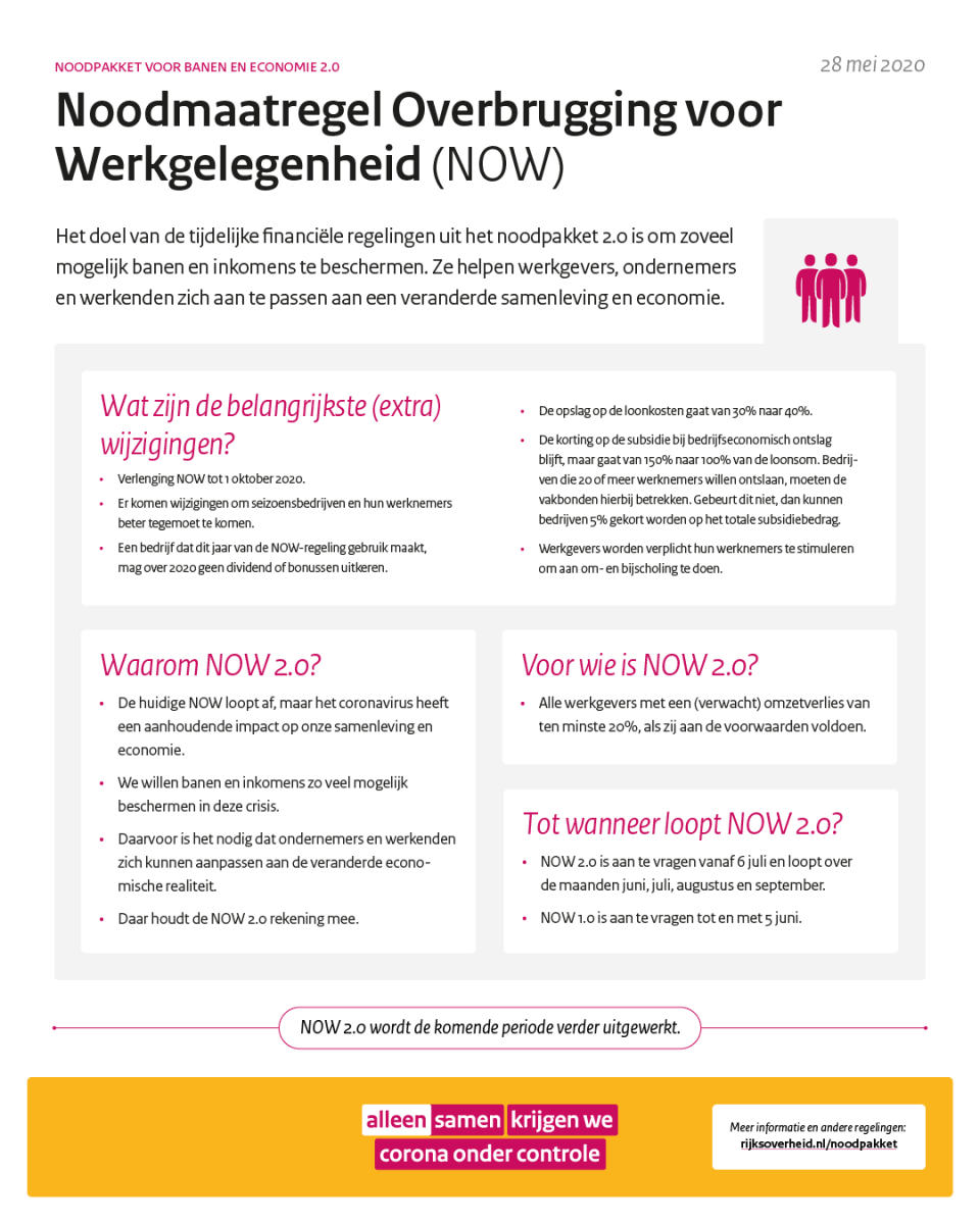 De NOW-regeling is bedoeld voor werkgevers die als gevolg van het coronavirus kampen met een substantieel omzetverlies (ten minste 20%). Zij kunnen bij het UWV een aanvraag indienen voor een tegemoetkoming in de loonkosten, en hiervoor een voorschot ontvangen. Hiermee kunnen zij werknemers met een vast en met een flexibel contract doorbetalen. De NOW is met ingang van 1 juni verlengd met 4 maanden tot 1 oktober. Deze NOW2.0 kan vanaf 6 juli worden aangevraagd en voorziet in tegemoetkoming op de loonkosten vanaf 1 juni. Werkgevers die te maken hebben met tenminste 20% verwacht omzetverlies, kunnen bij UWV een tegemoetkoming voor deze vier maanden aanvragen ter hoogte van maximaal 90% van de loonsom, gerelateerd aan het omzetverlies. De omzetdaling wordt dan vastgesteld over een viermaands periode die start op 1 juni, 1 juli of 1 augustus 2020 en volgt daarbij de systematiek van de eerste periode (NOW1.0).