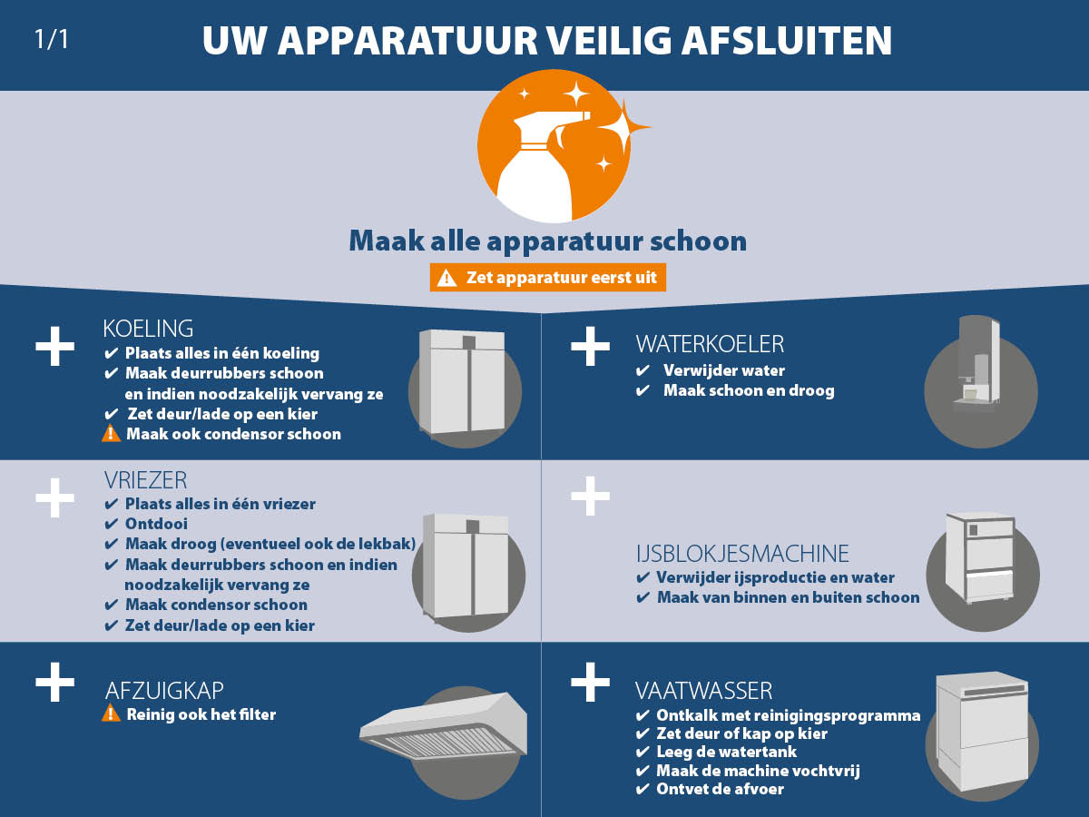 Apparaten die u voorlopig niet meer gebruikt en normaal standaard aan blijven staan – zoals ijsblokjesmachines en espressomachines – kunt u niet zomaar uitzetten. Aangekoekte resten veroorzaken verstoppingen als apparaten niet meer dagelijks worden gebruikt. Ook stof en vuil op condensors en afzuigfilters zijn grote boosdoeners. Kalkaanslag kan zelfs permanente schade aanrichten als het zich blijft ophopen. Bij vaatwassers kan kalk de verwarmingselementen flink beschadigen. Bovendien neemt de waterdruk van de machine af.