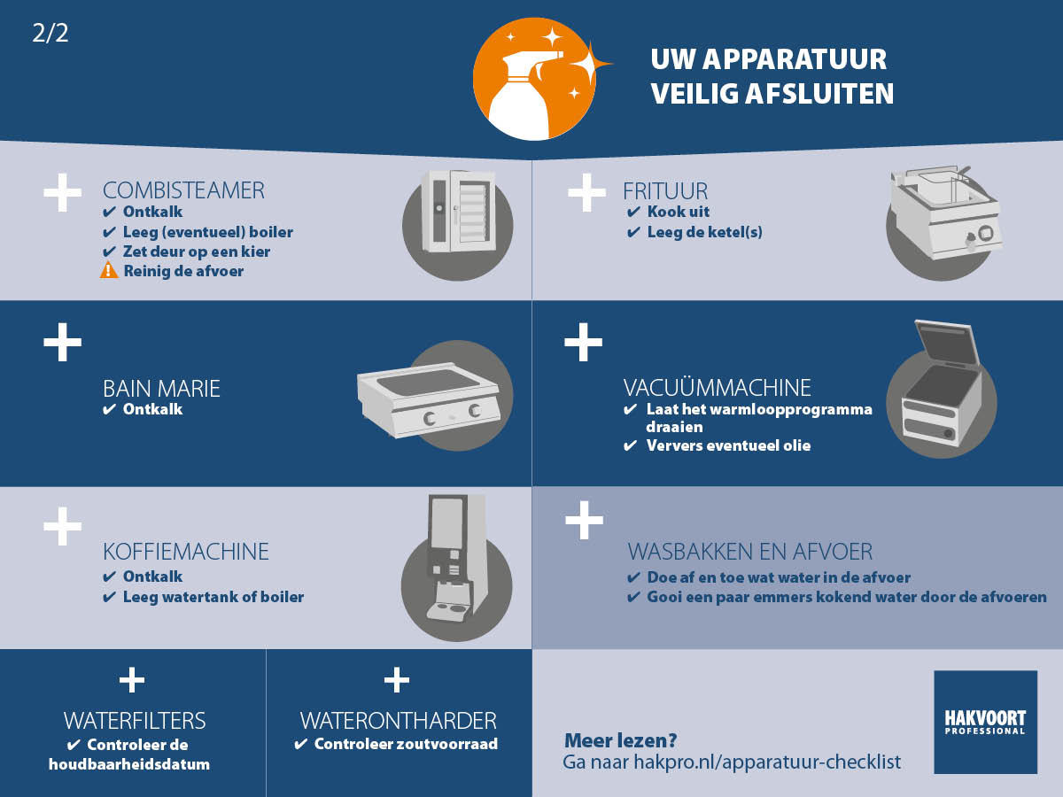 Nu de horeca op slot zit, staat veel keukenapparatuur opeens stil. Dat is niet ronder risico. Het langdurig stilstaan van horeca apparatuur kan zorgen voor schade aan de onderdelen. Een grondige reiniging – zoals ontkalken en het verversen van de olie - is bij veel apparaten noodzakelijk om schade te voorkomen. Met de handige checklist van Hakvoort Professional bent u goed voorbereid.