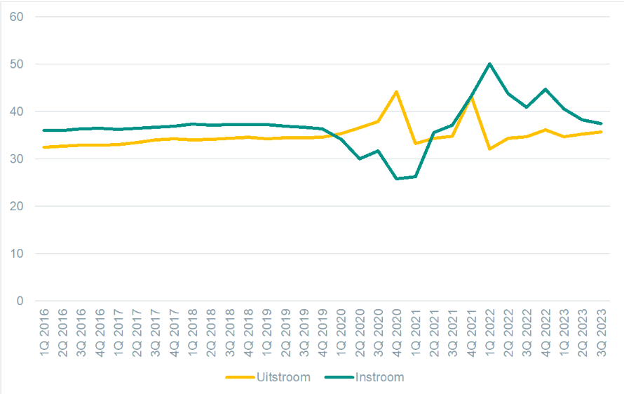 Bron: CBS. In- en uitstroom horecapersoneel als percentage van aantal hoofdbanen.